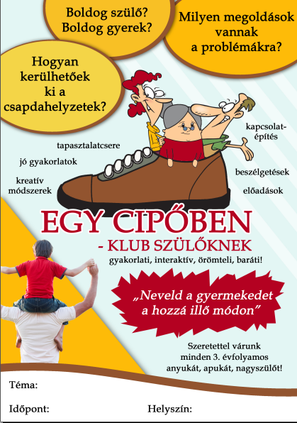 az „Egy cipőben” szülői klub által szervezett következő előadására, melynek címe: