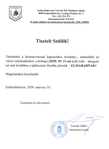 így a Székesfehérvári Vasvári Pál Általános Iskola is - 2020.03.16-tól.