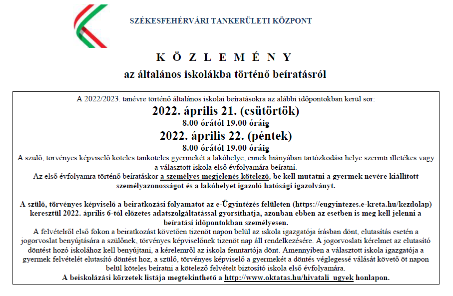 A beiratkozást segítő KRÉTA dokumentum - 2022
