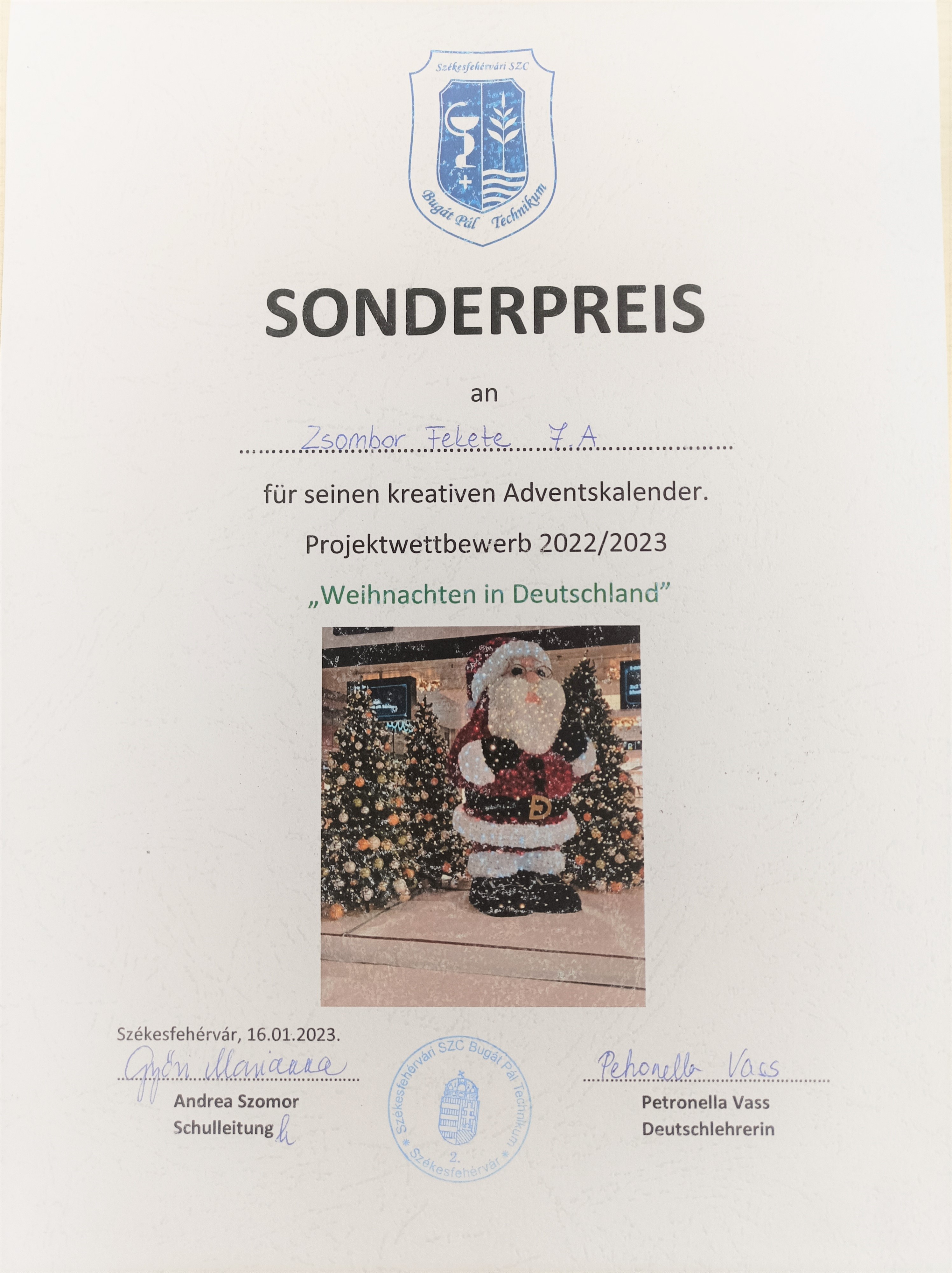 Székesfehérvári SZC Bugát Pál Technikuma német nyelvi projektversenyén Fekete Zsombor 7.a-s tanuló különdíjat kapott. Felkészítő tanár: Szabó Brigitta német szakos tanárGratulálunk!