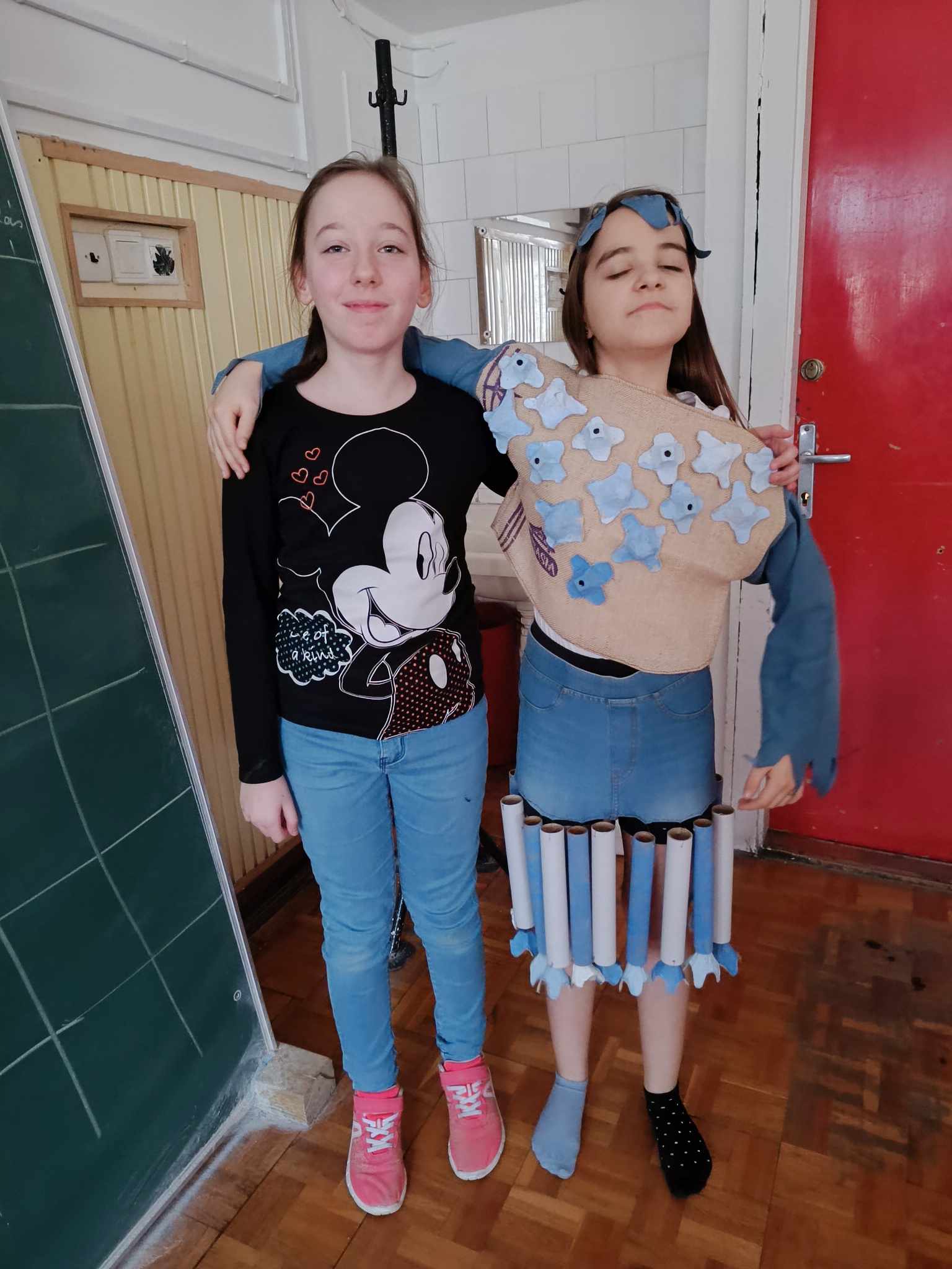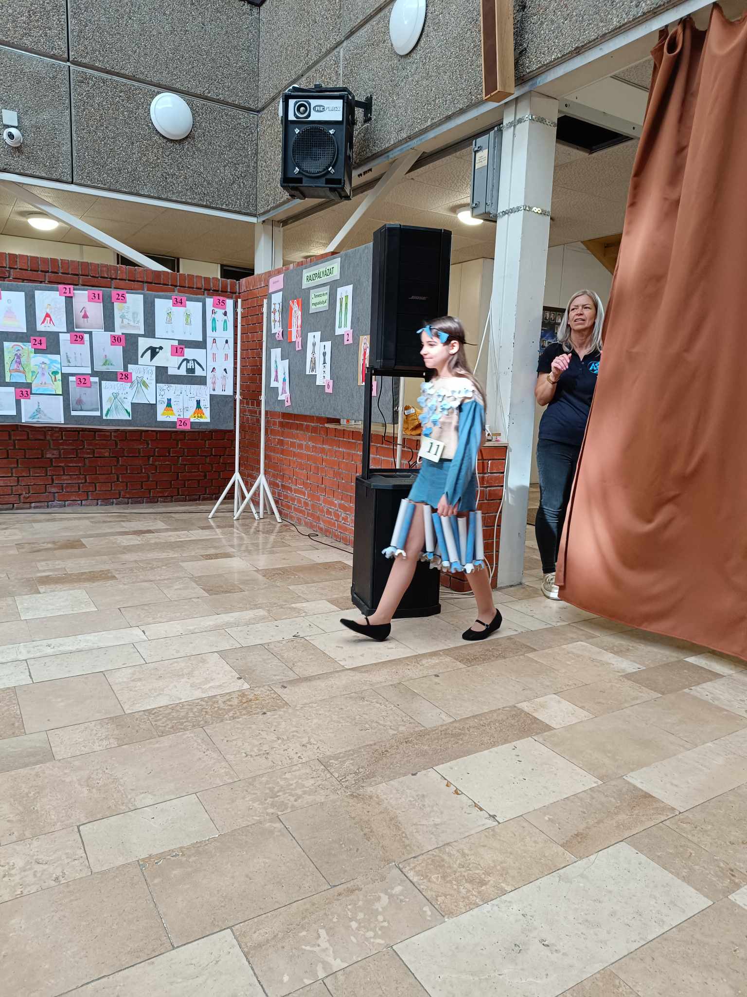 A lányokkal kétrészes ruhát terveztünk és készítettünk, melyhez egy rossz farmernadrágot, basmati rizs lenvászon zacskóját, tojástartókat és alufólia belsejét alkotó karton gurigákat használtunk. A ruhákat hangulatos zenés divatbemutatón és fotózáson vonultathatták fel a készítők.