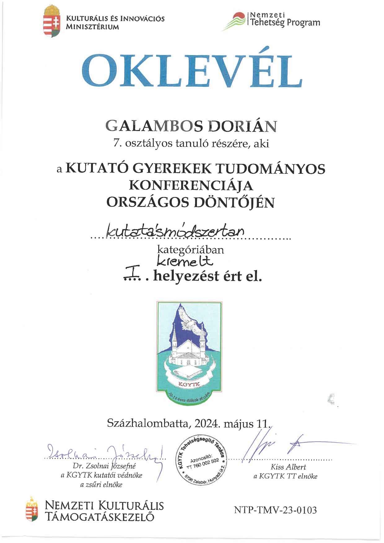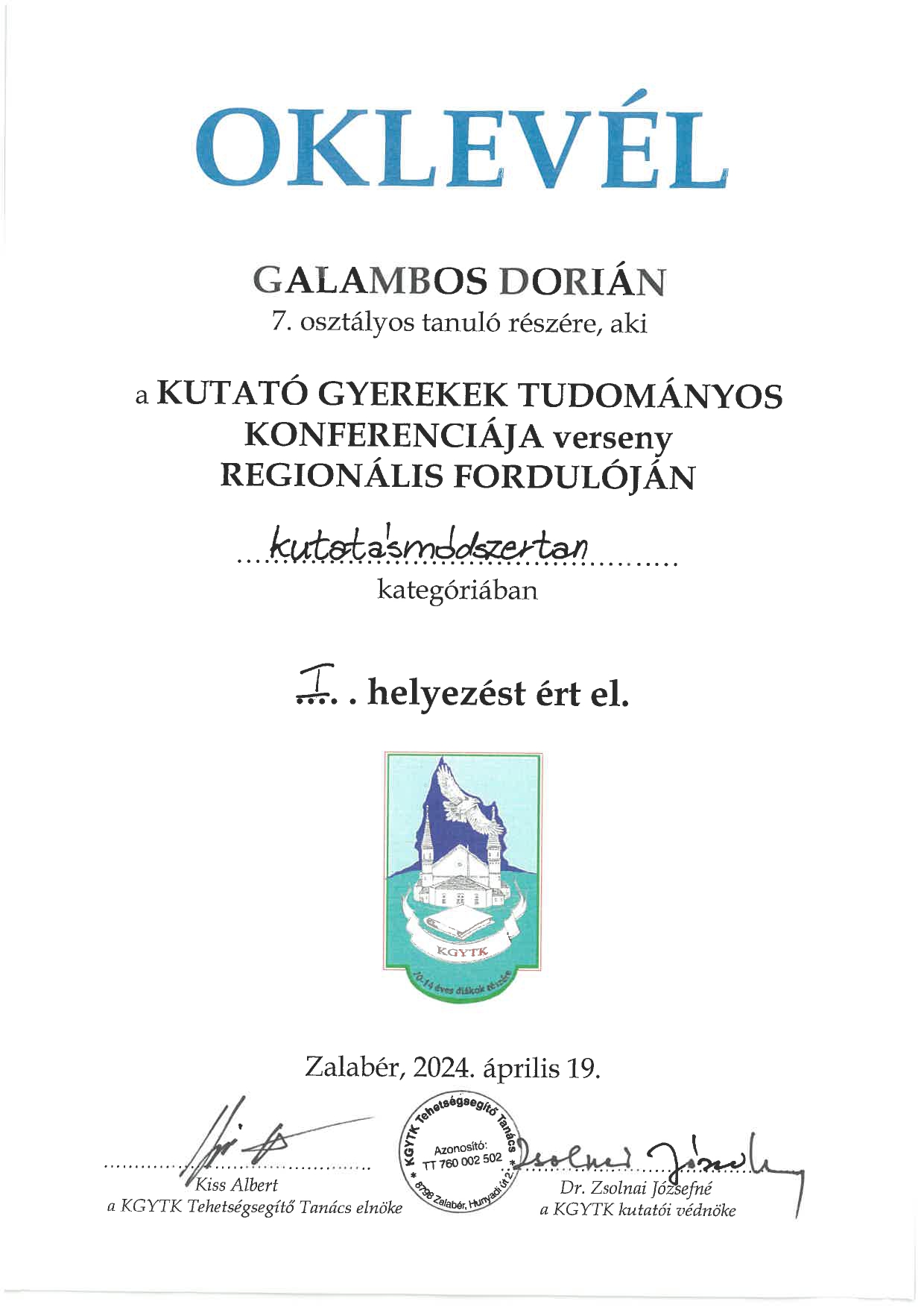 Galambos Dorián 7.a osztályos tanuló a Kutató Gyermekek