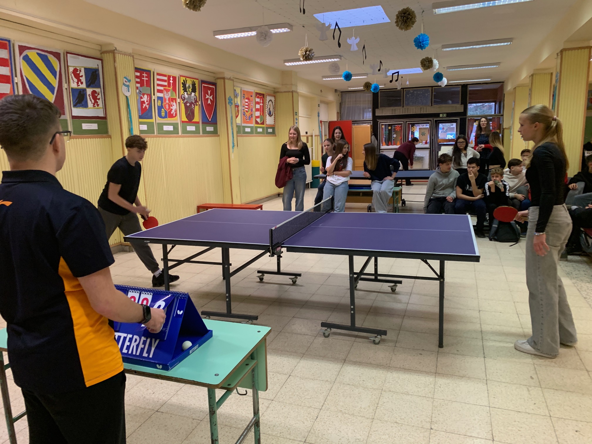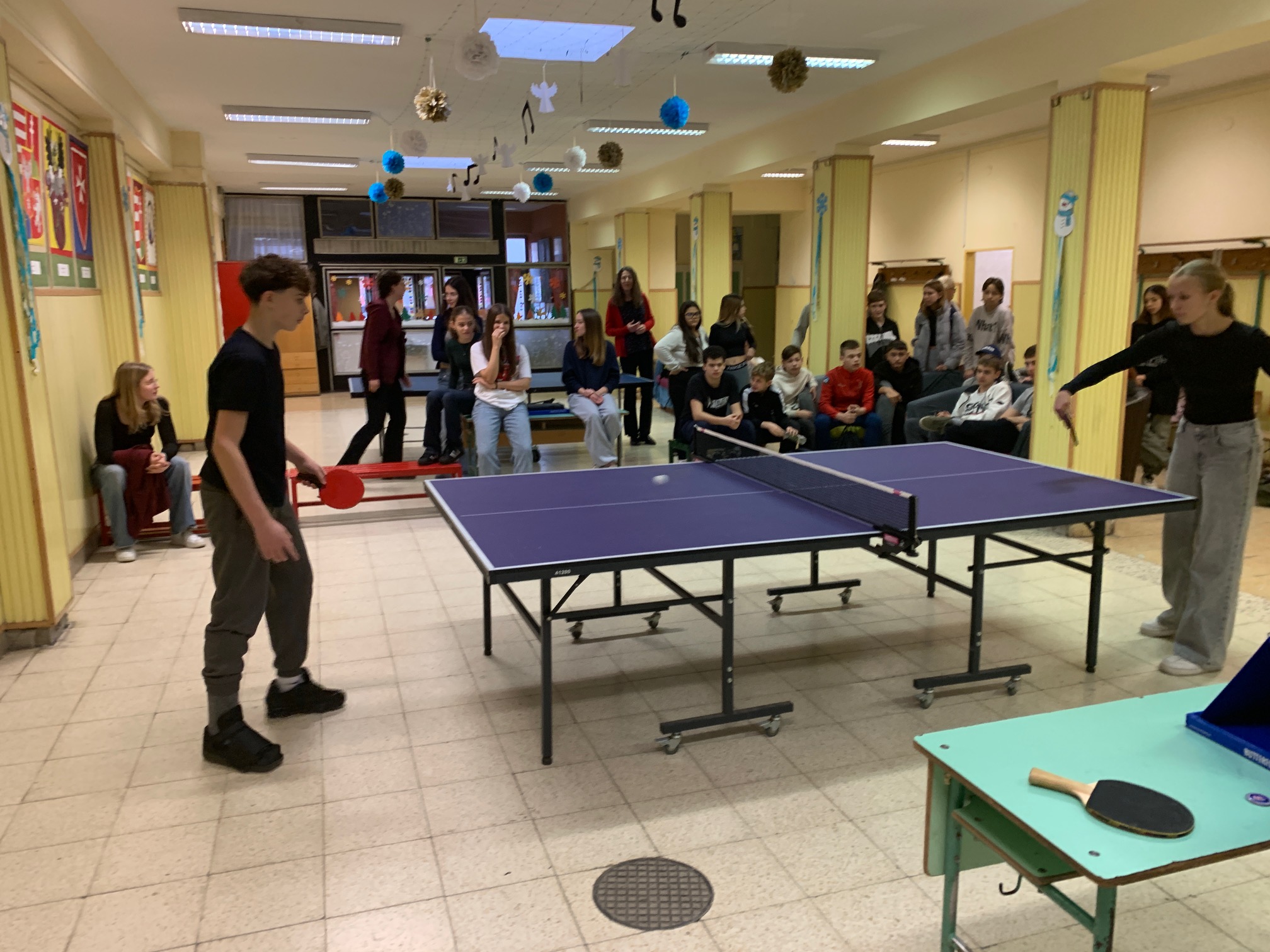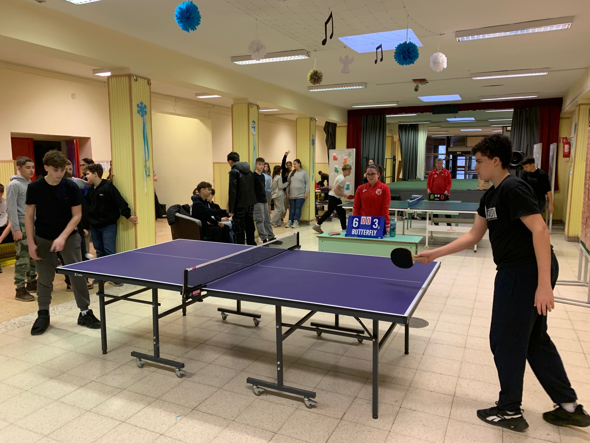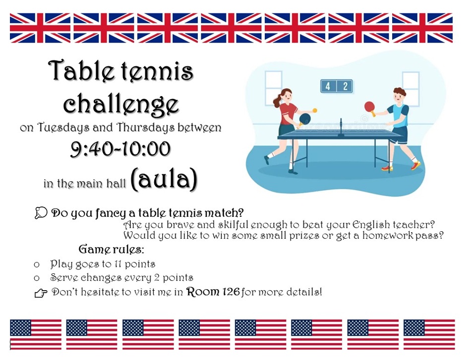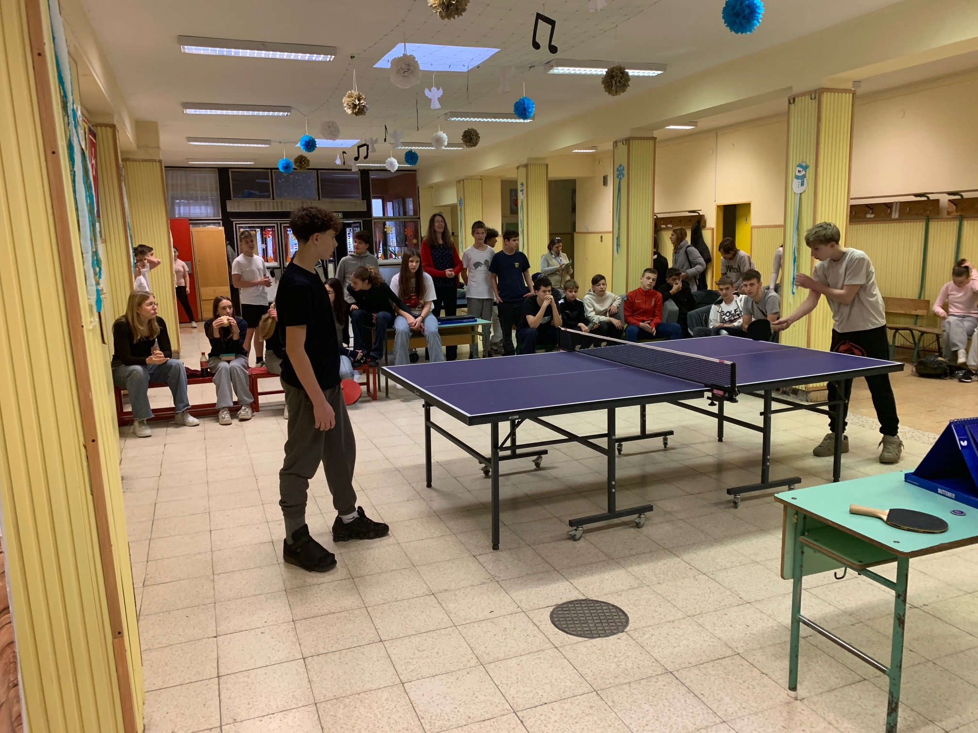 Verd meg az angoltanárodat, ha tudod! – avagy a fent meghirdetett iskolai asztalitenisz verseny első fordulója végéhez értünk: mintegy 30 résztvevő próbált szerencsét, hogy előbb érje el az áhított 11 pontot, mint tanára, és ezzel – kisebb ajándékok és egy HF-felmentés mellett – esélyt kapjon a december 13., szombati döntőbe kerülésre. Izgatottan várjuk, hogy a kilenc továbbjutó, Szerdahelyi Tímea (6.b), Szente Dorka, Balázs Bence, Korponay Nimród (7.a), Csuti Áron (7.b), Bálványos Nóra, Tóth Máté (8.a), Köller Zénó és Rokochuk Igor (8.c) közül kik tudnak majd éremmel távozni.