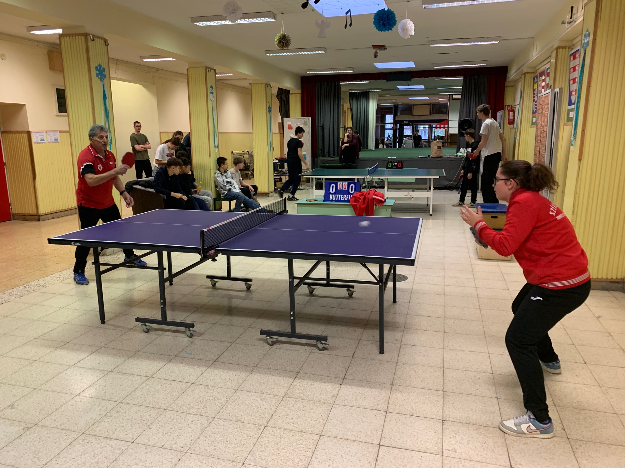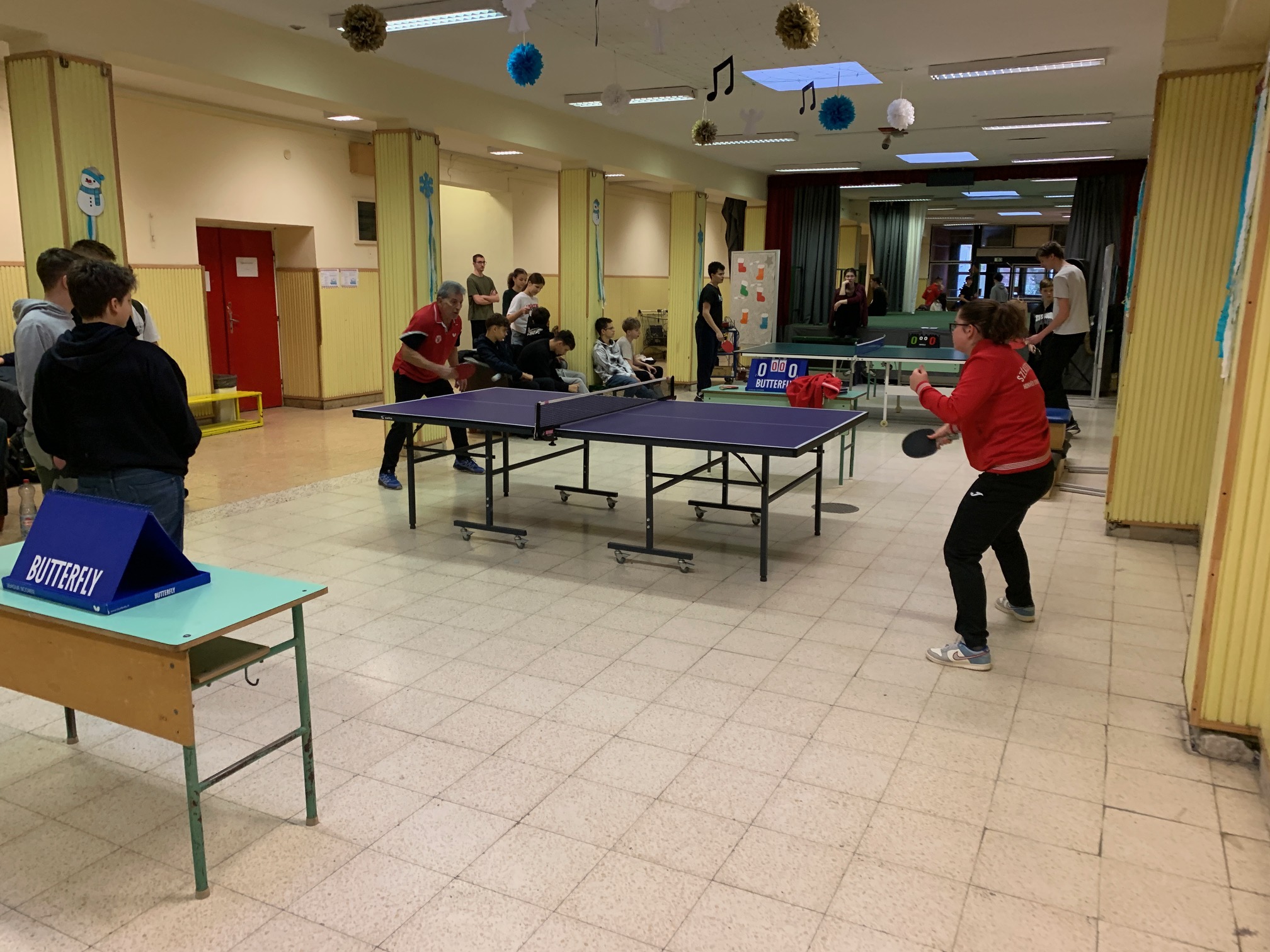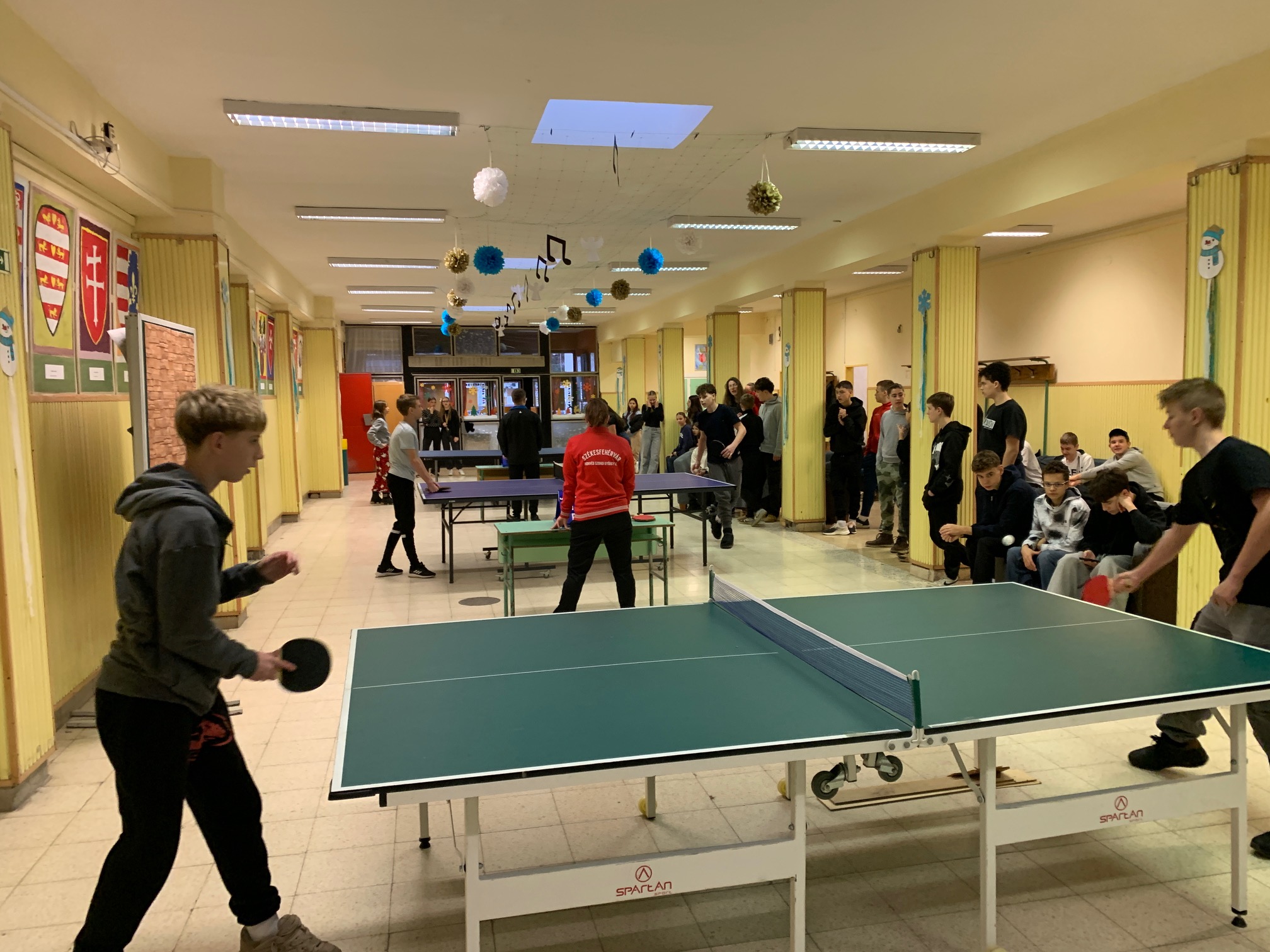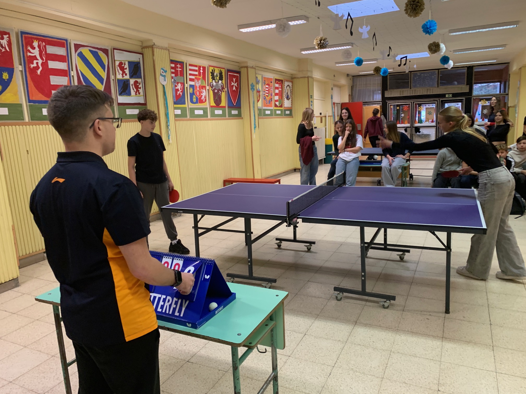 Verd meg az angoltanárodat, ha tudod! – avagy a fent meghirdetett iskolai asztalitenisz verseny első fordulója végéhez értünk: mintegy 30 résztvevő próbált szerencsét, hogy előbb érje el az áhított 11 pontot, mint tanára, és ezzel – kisebb ajándékok és egy HF-felmentés mellett – esélyt kapjon a december 13., szombati döntőbe kerülésre. Izgatottan várjuk, hogy a kilenc továbbjutó, Szerdahelyi Tímea (6.b), Szente Dorka, Balázs Bence, Korponay Nimród (7.a), Csuti Áron (7.b), Bálványos Nóra, Tóth Máté (8.a), Köller Zénó és Rokochuk Igor (8.c) közül kik tudnak majd éremmel távozni.