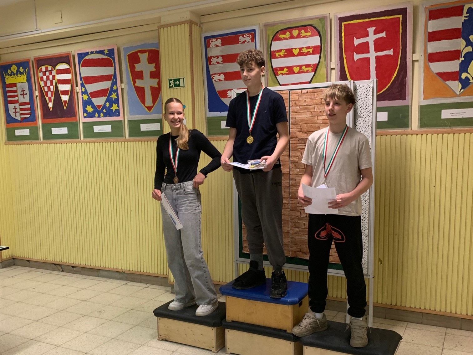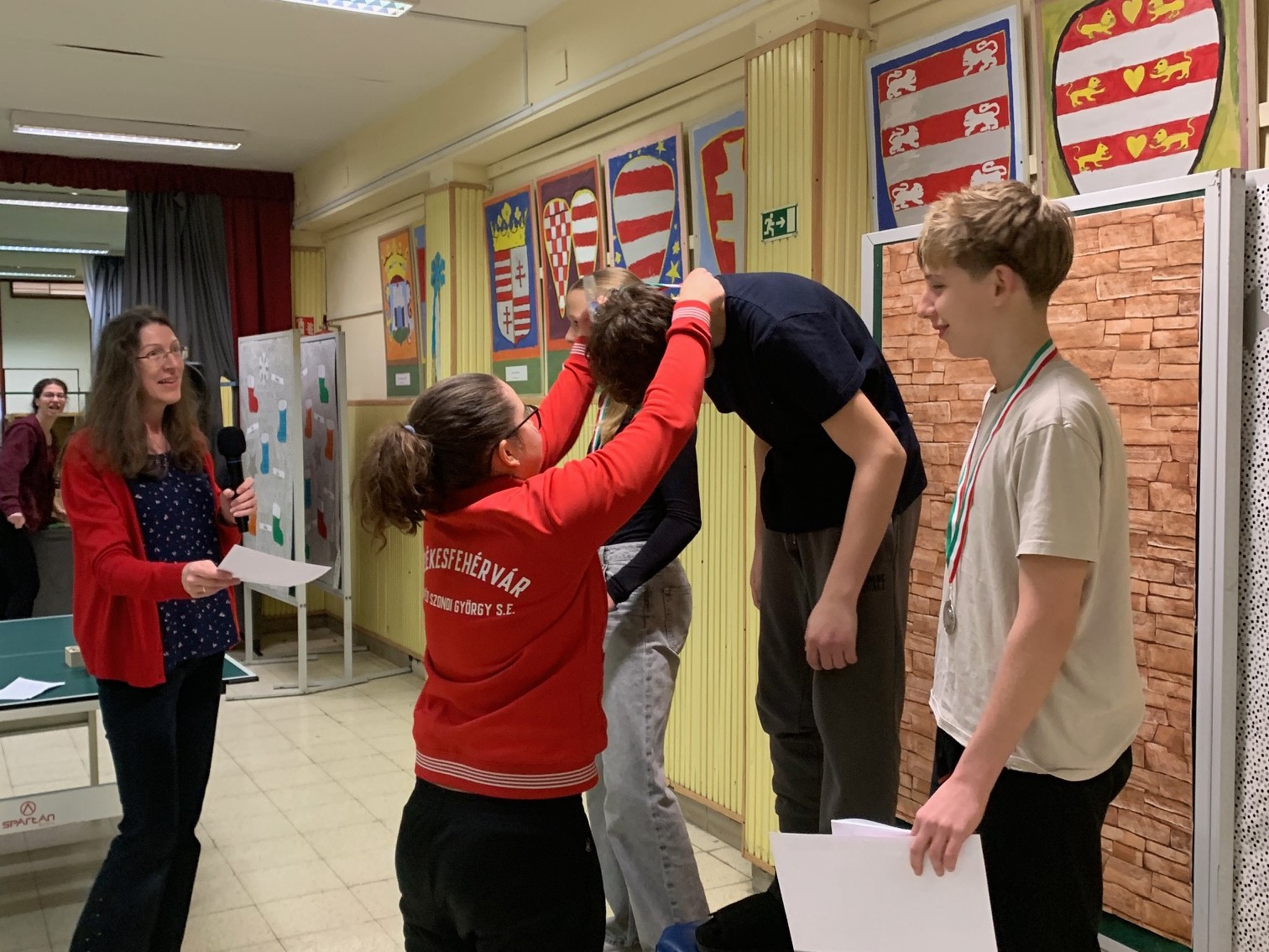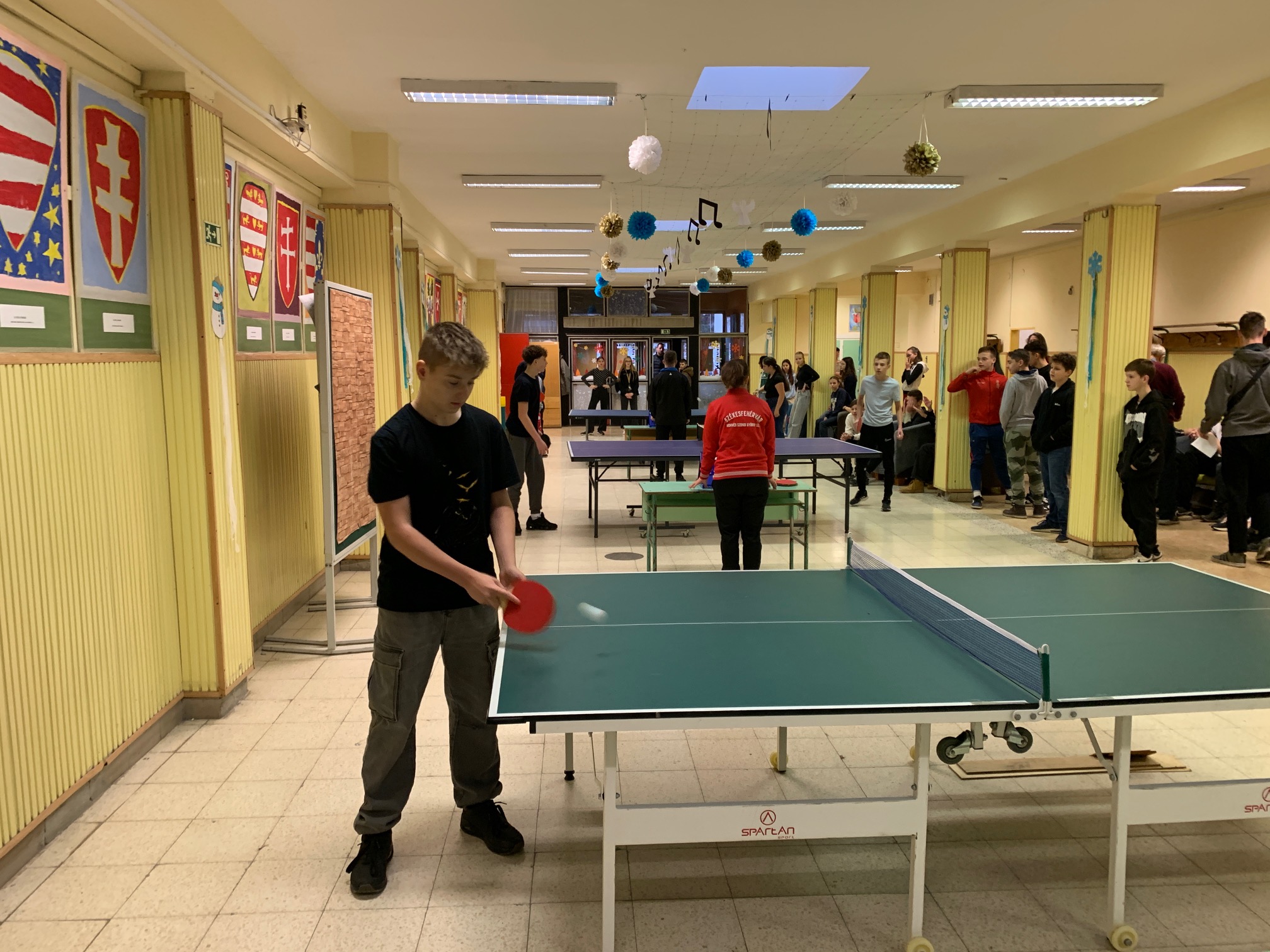 Jó hangulatban, hangos szurkolással zajlott le a szombati, várva várt iskolai pingpong döntő, ahova minden játékos, aki angoltanára ellen már bizonyított, 5 barátját hívhatta meg: 9 lelkes diákunk 3 asztalon játszott először csoportmérkőzéseket, majd ahogy szűkült a kör, az asztalok győztesei vettek részt egymás elleni körmérkőzésen. Rendkívül szoros meccseket láthattunk, körbeveréssel: az aranyérmes Csuti Áron (7.b) 5:3-as, az ezüstérmes Tóth Máté (8.a) 5:5-ös, míg a bronzérmes, s egyúttal legjobb női játékosunk, Bálványos Nóri (8.a) 3:5-ös szettaránnyal állhatott dobogóra. Gratulálunk a győzteseknek és hálásan köszönjük a Honvéd Szondi SE Asztalitenisz Szakosztályának, hogy a döntő lebonyolításának oroszlánrészét átvállalták! Köszönjük továbbá a díjazottaknak felajánlott tanári ajándékokat: István bácsi tapsgépét, Kinga néni bónusz pontjait matematikából, Juci néni és Gábor bácsi egyszeri testnevelés felmentését és a nyelvszakos kollégák által felkínált rendkívüli HF -bliccelési lehetőséget! Garantáltan élni fognak vele! :)