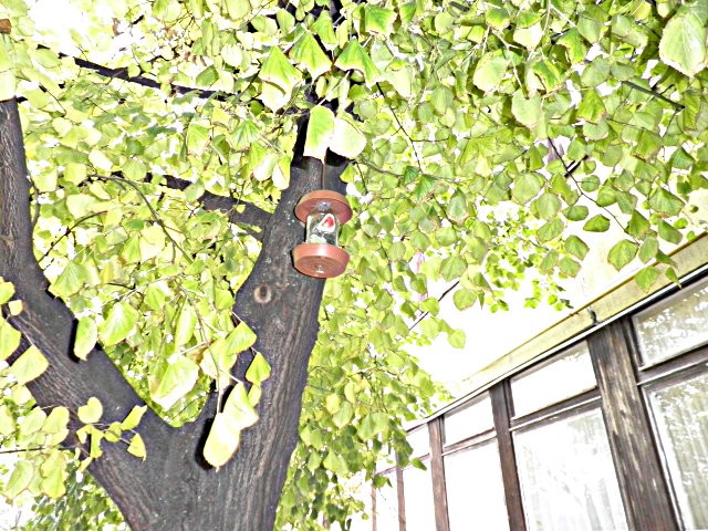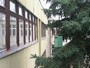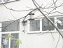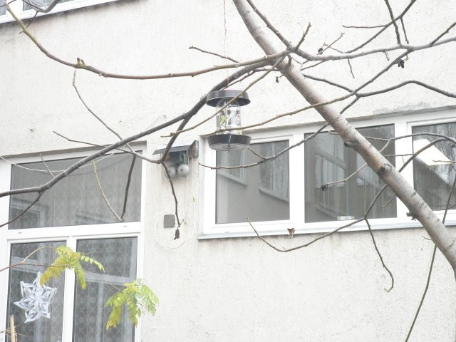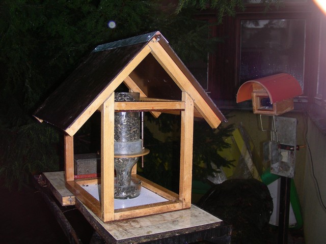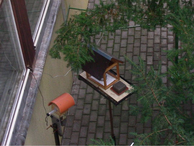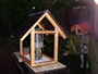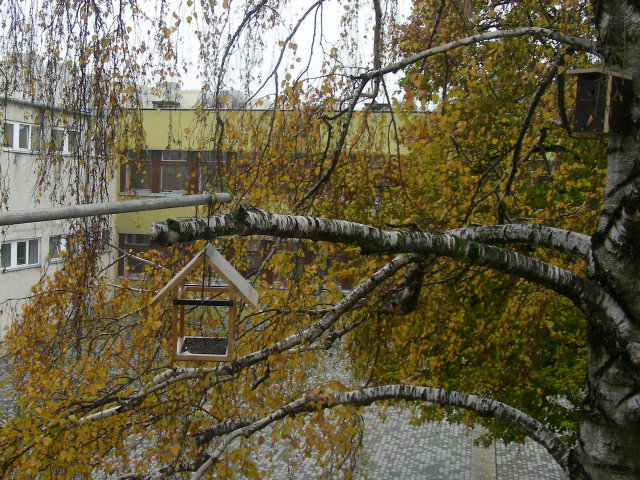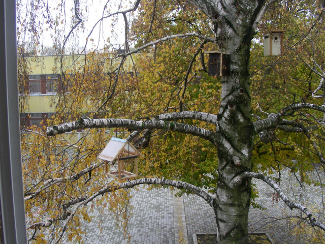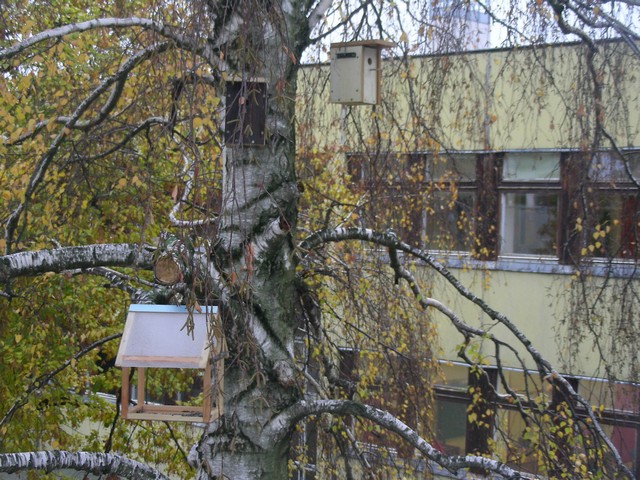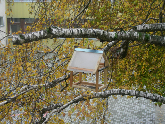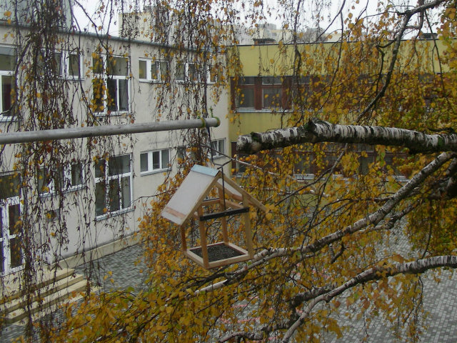 Ház alakú madáretető a technika terem ablaka alatt és az informatika terem előtt a magasban.