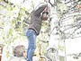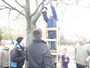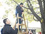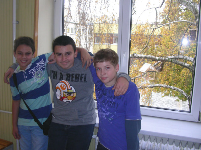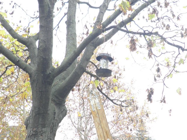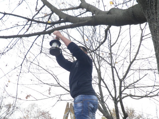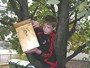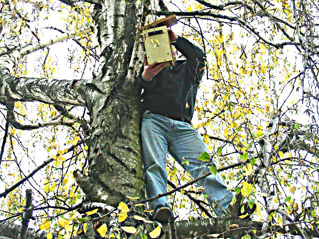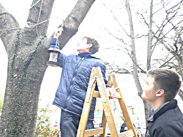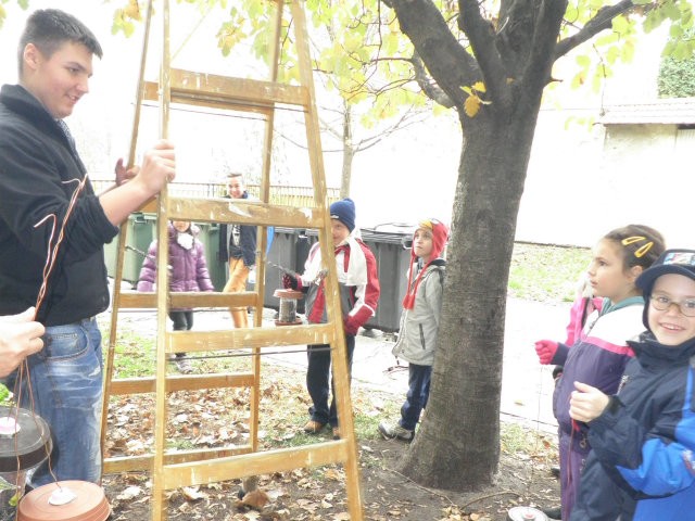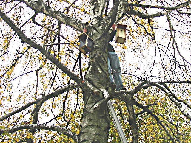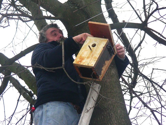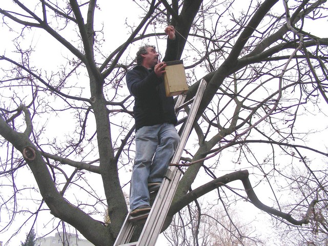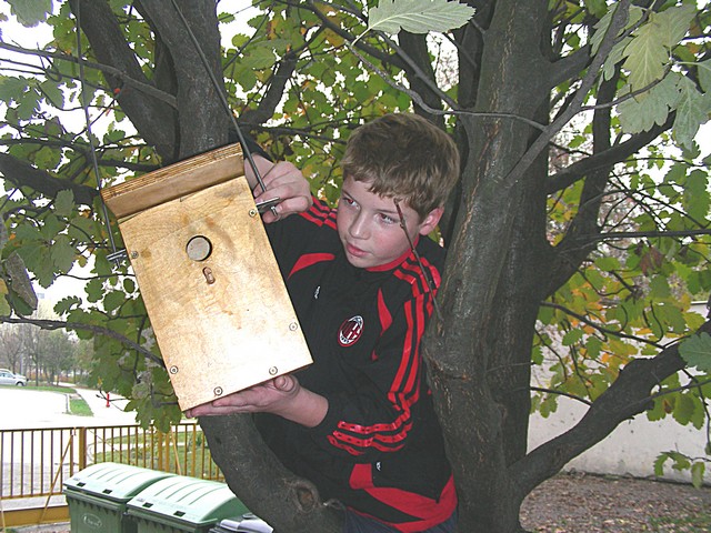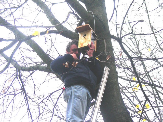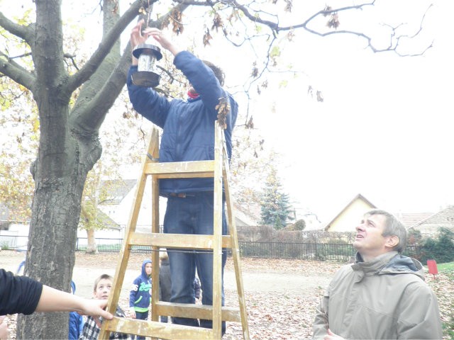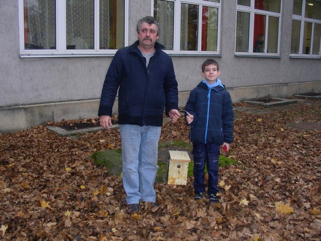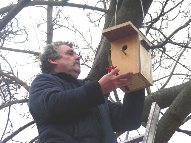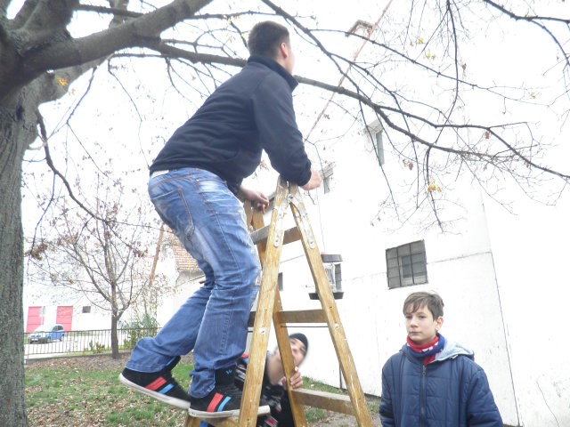Madárodúk kihelyezését Sanyi bácsi segítette nem félve a magaslatokban, no meg a 7.b osztály az informatika előtt