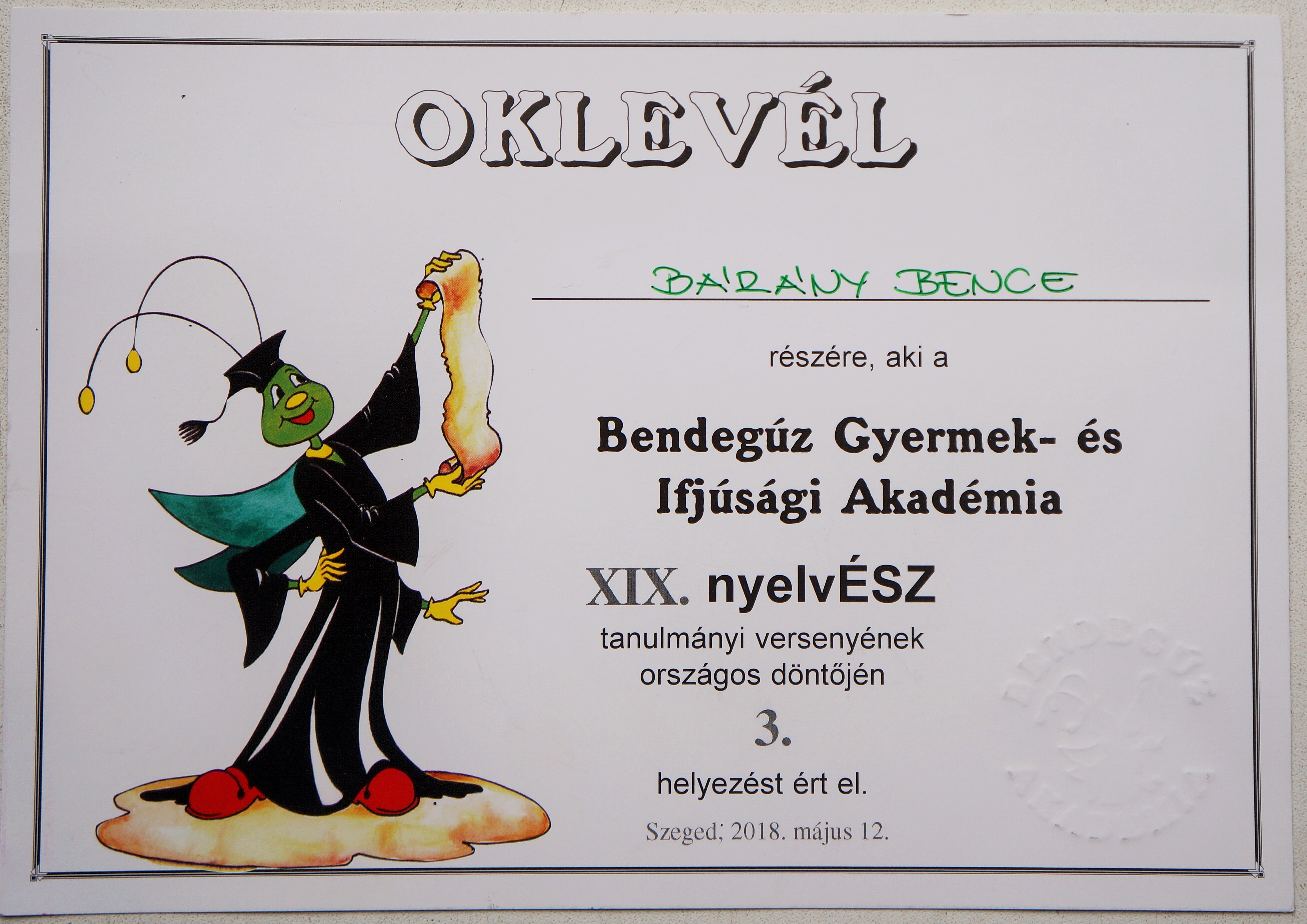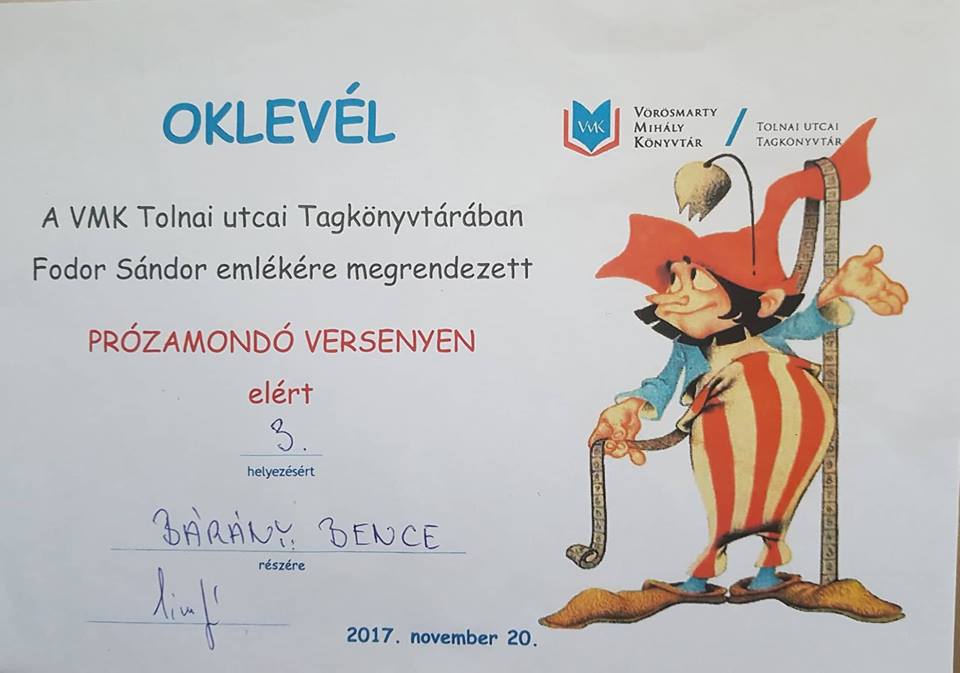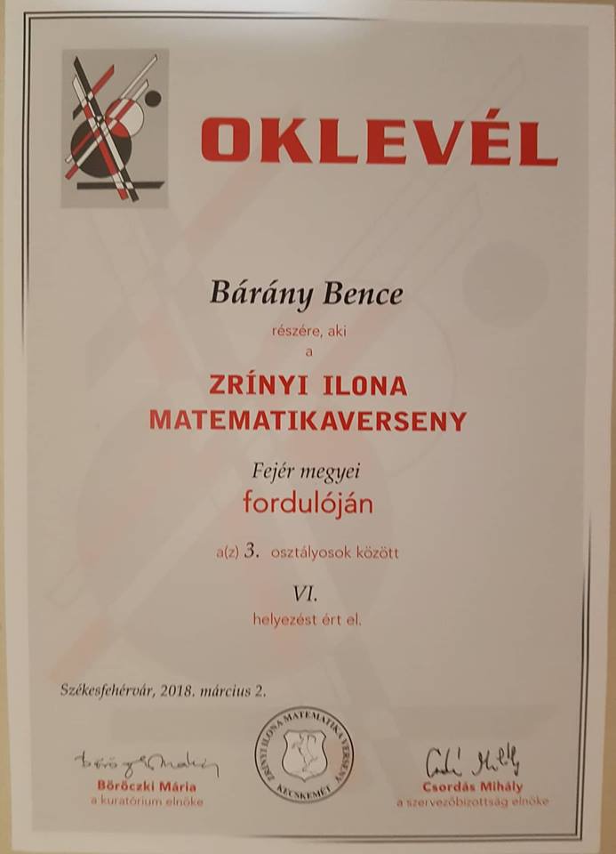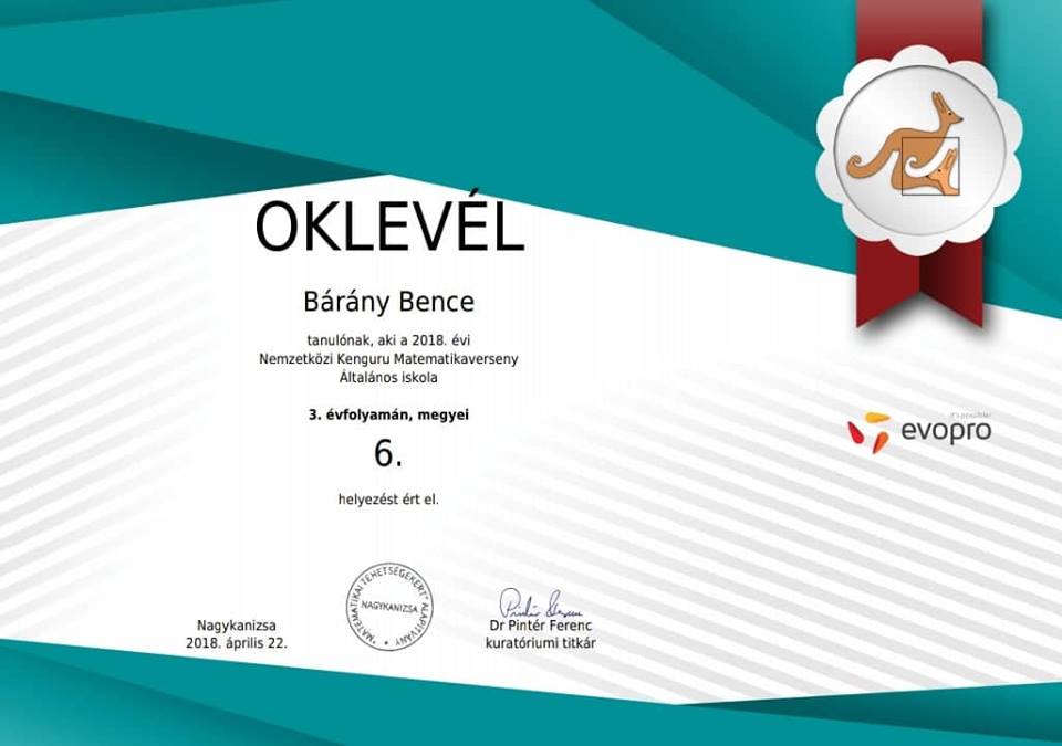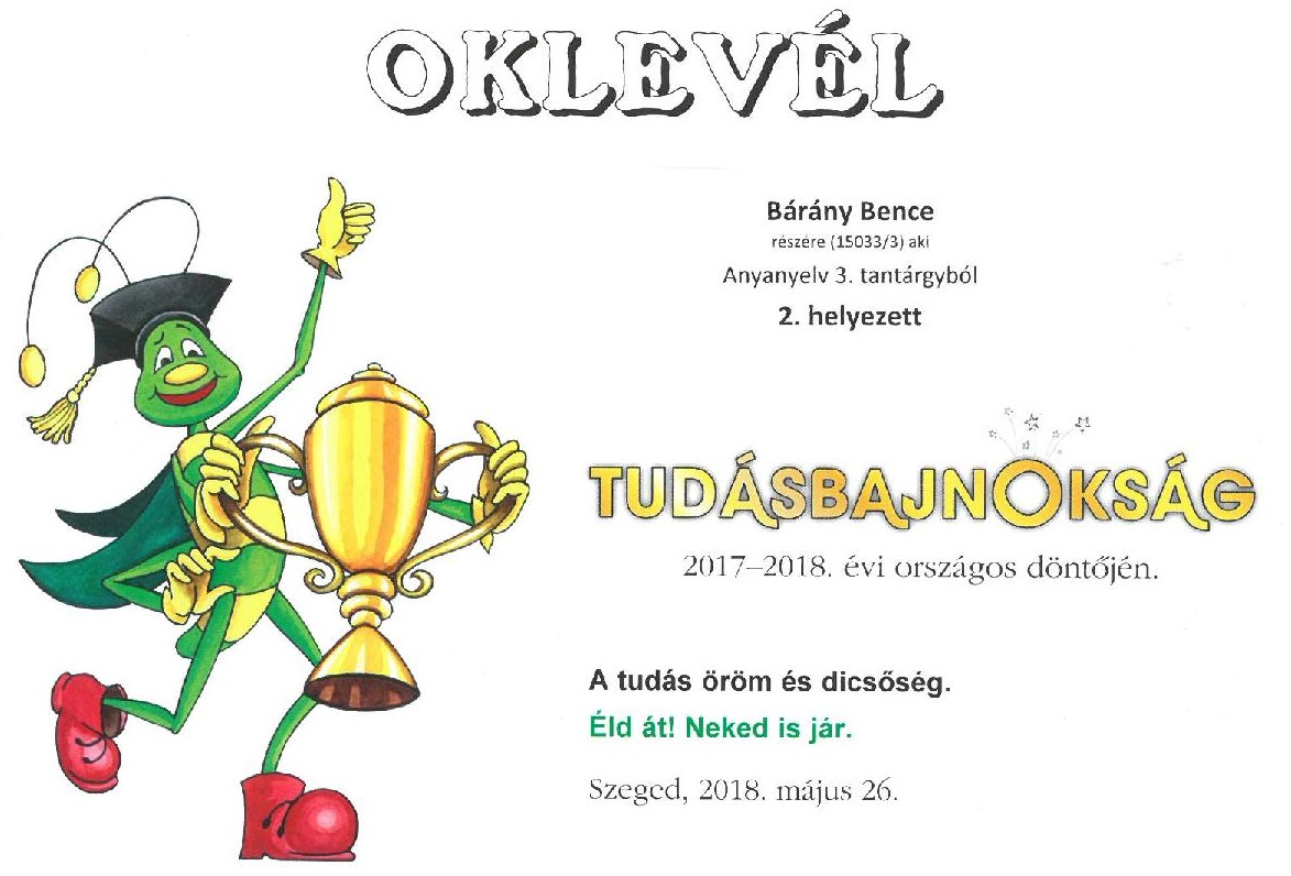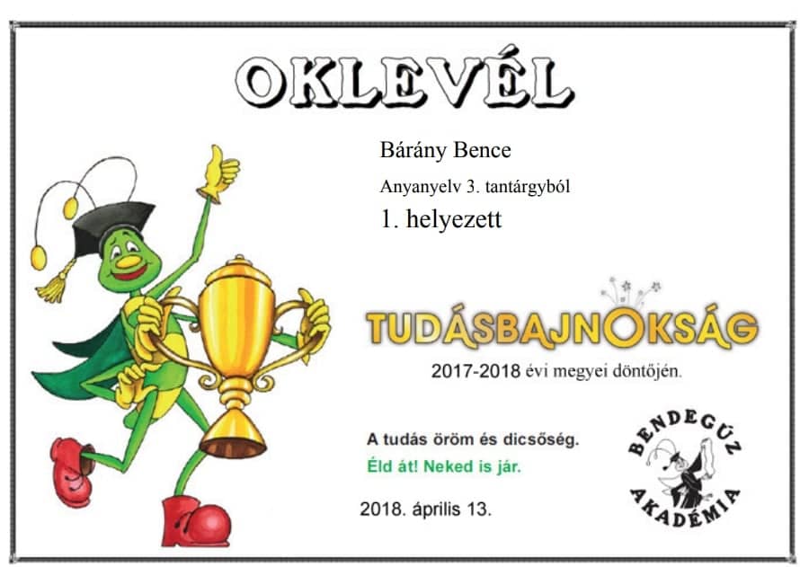 Egyik legsikeresebb tanítványunk Bárány Bence 3.a