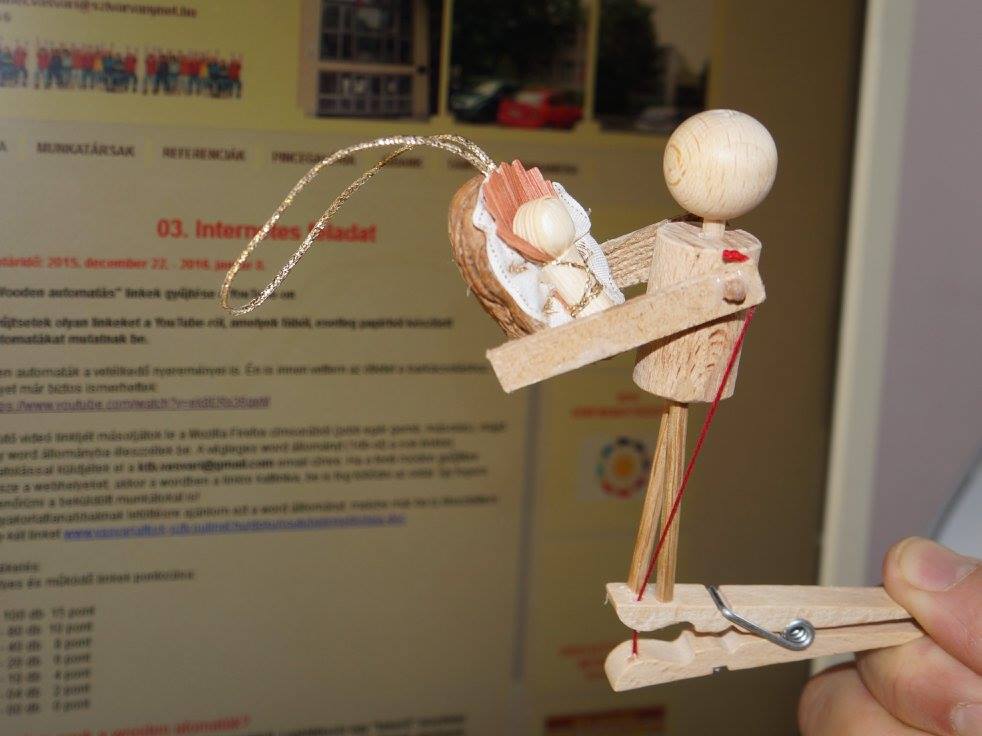 Készítsetek egy csipeszes mozgó figurát és annak klipjét. A klip tartalmazza a készítés menetét és a figura működőképességét. A kész figura a lenti képen látható.