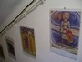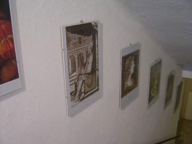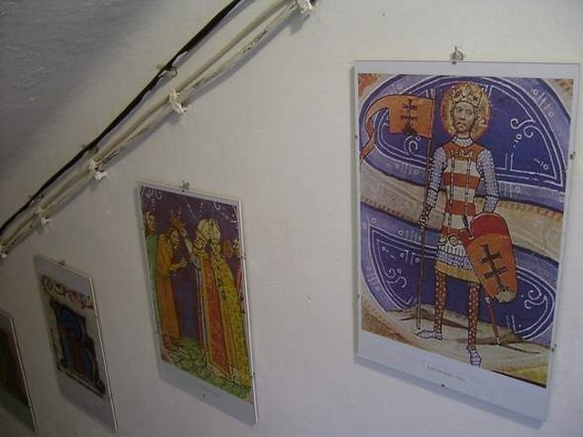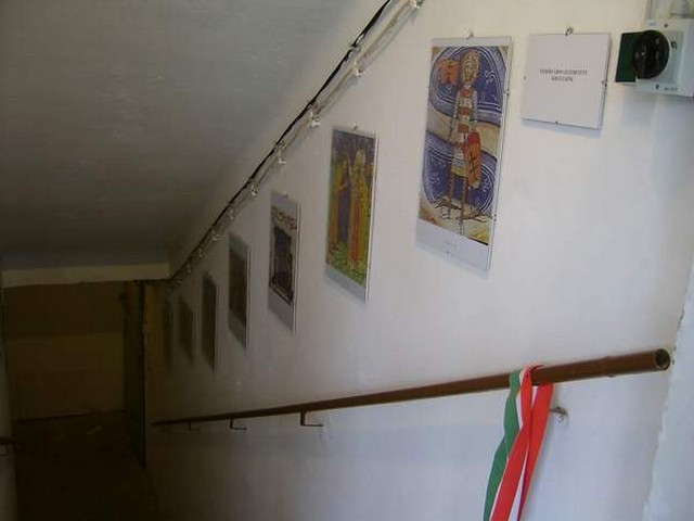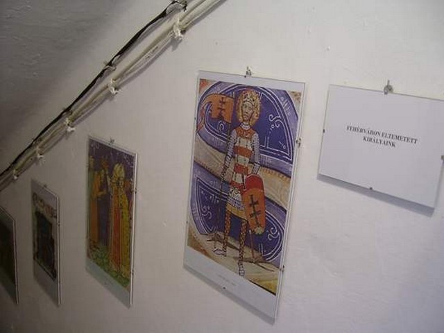 A galéria lejáratának két oldalán a Székesfehérváron eltemetett királyokról készült iniciálék reprodukciói láthatók.